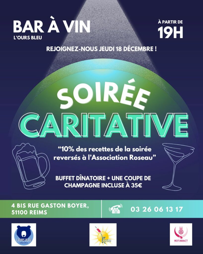 Le ROTARACT de Reims organise le 18 décembre une soirée caritative à l’Ours Bleu, 4 Bis Rue Gaston Boyer. Réservation au 03.26.06.13.17