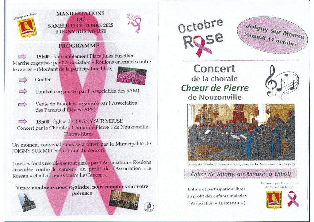 Ce samedi 11 octobre 2025, Roseau était à l’honneur dans le village de Joigny sur Meuse. L’association Roulons Ensemble Contre le Cancer organisait dans l’après-midi une marche et en soirée un concert au profit de Roseau. Cet évènement se déroulait en collaboration avec les associations les 3 AMJ et les Parents d’élèves, et le support logistique de la municipalité.