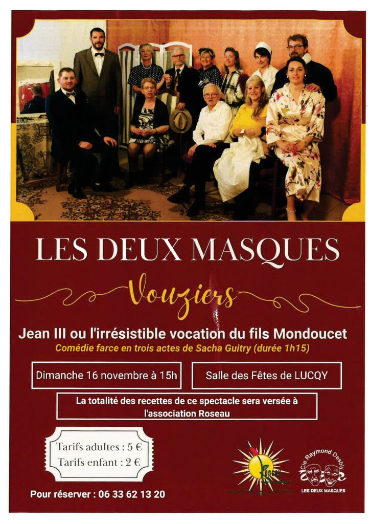 Suite et fin de la saga dominicale du Comité Ardennes avec dimanche 16 novembre 2025 après-midi la représentation à Lucquy de la troupe « Les Deux Masques ».