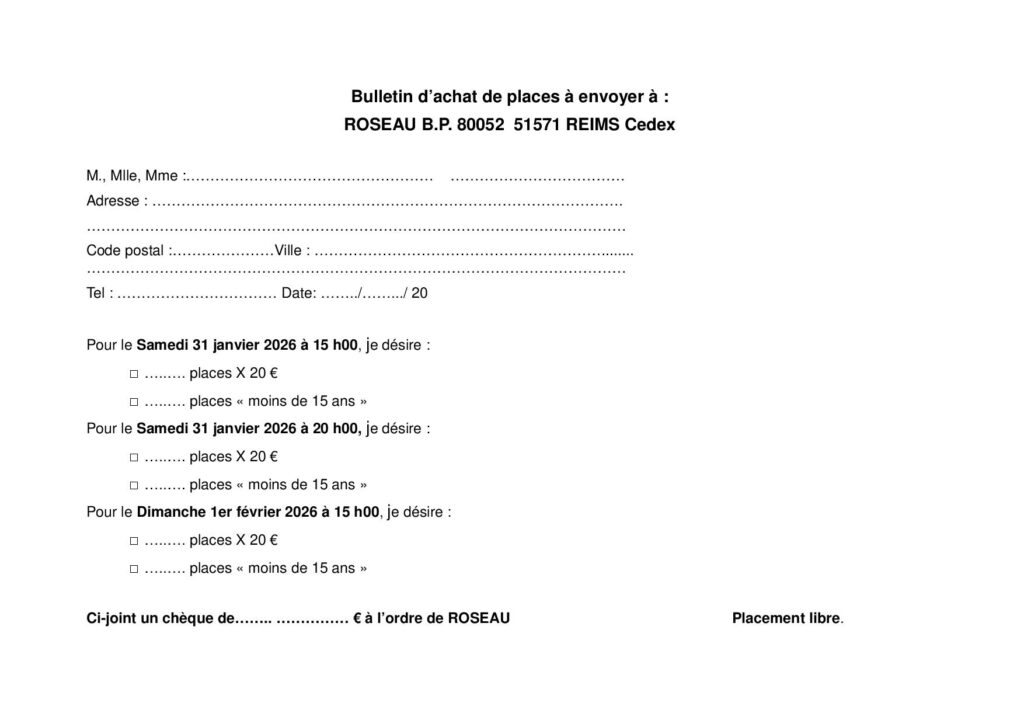 La billetterie est ouverte auprès de Carrefour, Cultura, Fnac et Leclerc. Il est possible également d’acheter vos places auprès de l’association Roseau par mail (association.roseau@wanadoo.fr) ou par courrier à l’aide du bulletin de réservation joint à cette annonce.